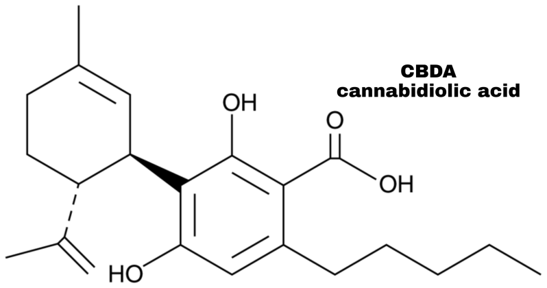 CBDA, of voluit cannabidiolic cannabidiolzuur is een natuurlijke, niet-psychoactieve cannabinoïde die in verse cannabisplanten voorkomt. Structureel gezien is cannabidiolic vergelijkbaar met cannabidiol (CBD), met als verschil de toevoeging van carbonzuur aan de centrale ring. CBDA wordt door een biosynthetisch proces, dat in de plant plaatsvindt, gevormd uit cannabigerolic. Wanneer CBDA vervolgens zou worden gedecarboxyleerd, wordt de zure vorm omgezet in CBD, de neutrale vorm. Het cannabidiolzuur-molecuul is samengesteld uit 56 atomen (22 koolstofatomen, 30 waterstofatomen en 4 zuurstofatomen), die door 57 atoombindingen met elkaar worden verbonden. Deze atoombindingen bestaan uit 27 niet-waterstof bindingen.